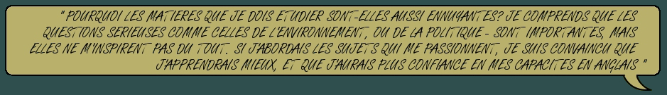 J'ai fait l'expérience d'apprendre une deuxième langue, et je peux vous confirmer qu'il n y a rien de pire que de travailler des sujets qui ne nous inspirent pas. C'est possible que vous vouliez vraiment produire un travail fluide, intéressant et sans défaut, mais souvent, vous vous trouvez distrait. Vous savez que vous pourriez finir le projet en deux heures, mais vous y peinez toujours après six heures. Quand vous avez enfin le courage de le vérifier, vous êtes déçu: votre travail manque de consistance, et vous savez bien que vous êtes capable de faire mieux. Quand vous avez commencé à apprendre l'anglais, vous étiez enthousiaste et motivé, mais maintenant vous en perdez l'intérêt; du coup, vos notes et votre motivation dépérissent.